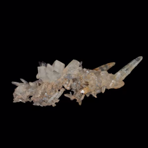 Colorless to white, translucent rhombs to 1.5 cm on edge. A skeleton of quartz crystals, some with an iron patina, supports the magnesite crystals.